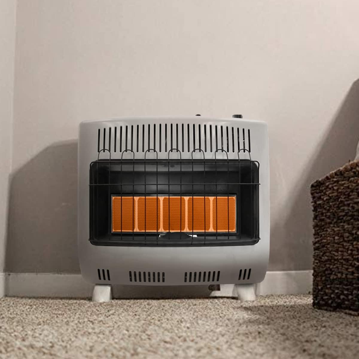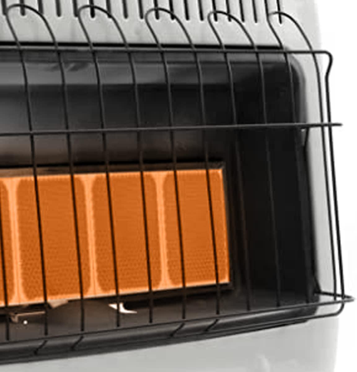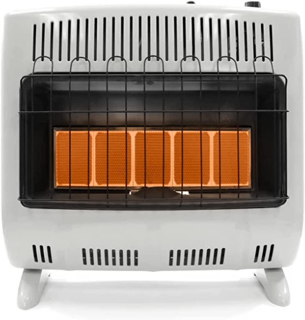 - Liquid propane ready – blue flame – 30,000 BTU/hr. – heats up to 750 square feet,