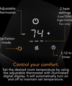 - EASY TO USE — Illuminated touch controls operate the 1-12 hour timer, oscillation mode, 2 heat settings (Low/750W, High/1500W), and fan only option to tailor heat output and energy consumption
