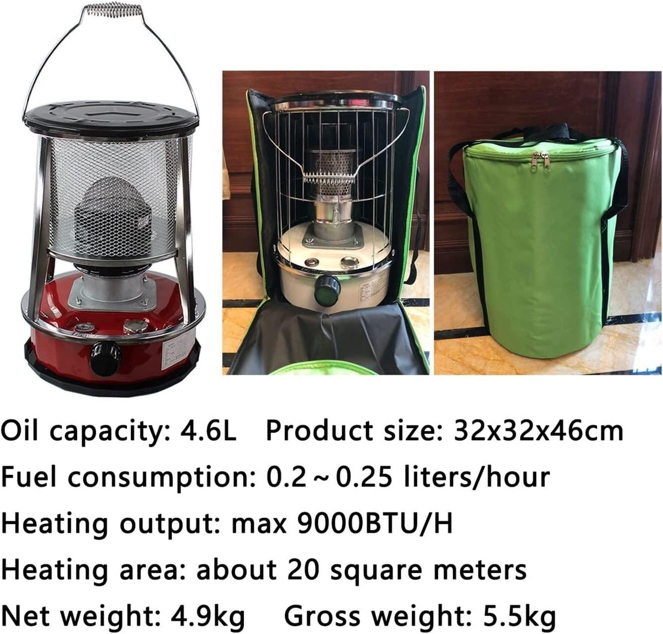 - ☀Efficient heating: the kerosene heater has a maximum heat output of 9000 BTU/H (equivalent to 2600W) and an oil consumption of 0.2~0.25L/hr. It can quickly heat up a room of approximately 20 sqm.