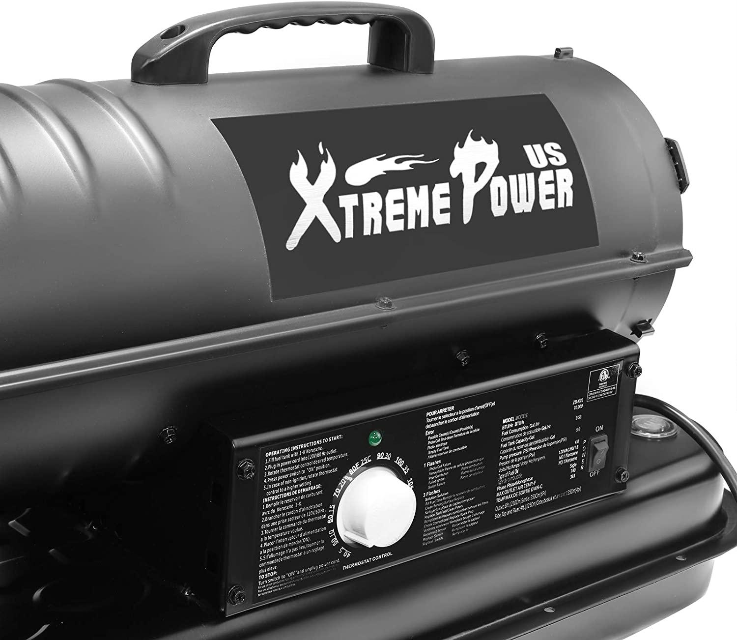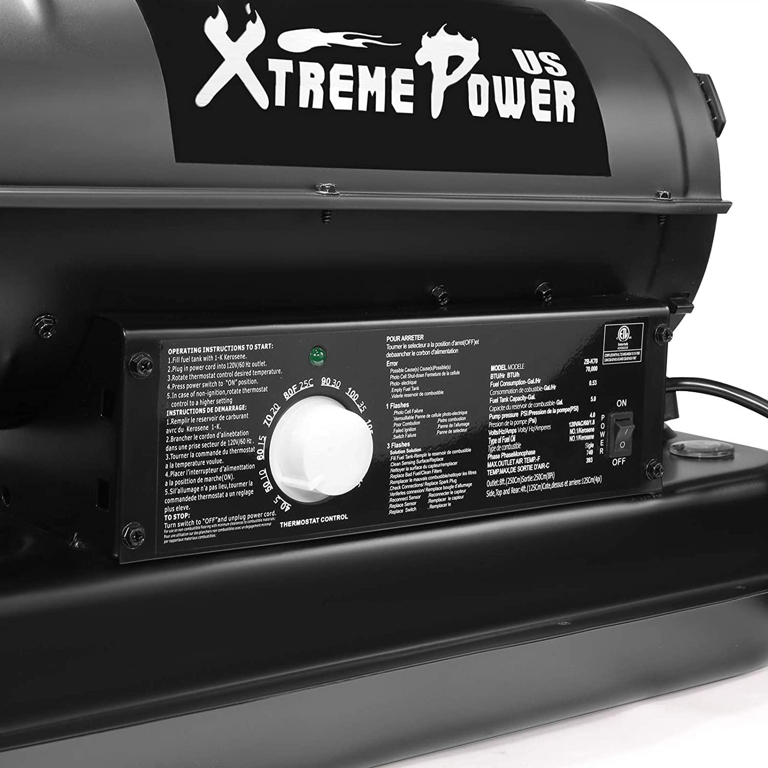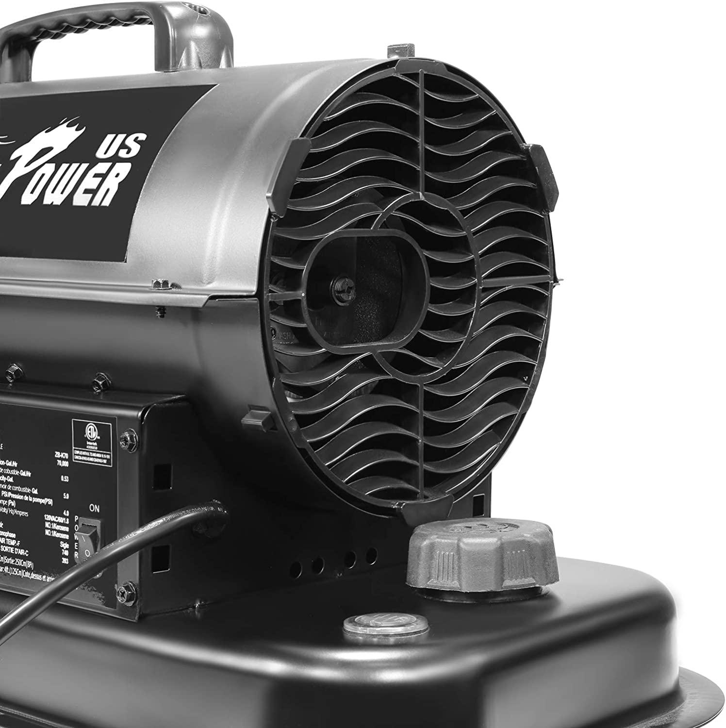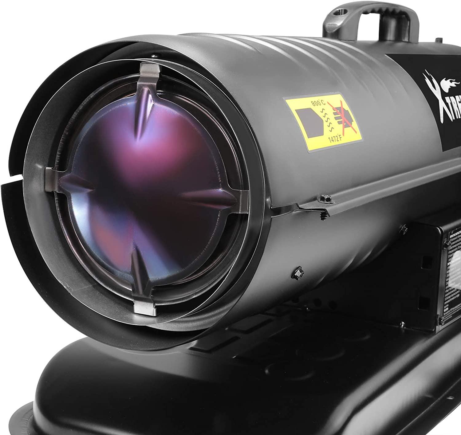 - Kerosene forced air heater has adjustable thermostat of heating output options, and its powerful oxygen supply completely burns the fuel for rapid heating. Due to its excellent heating performance, the heating space can reach 2,000 sq ft