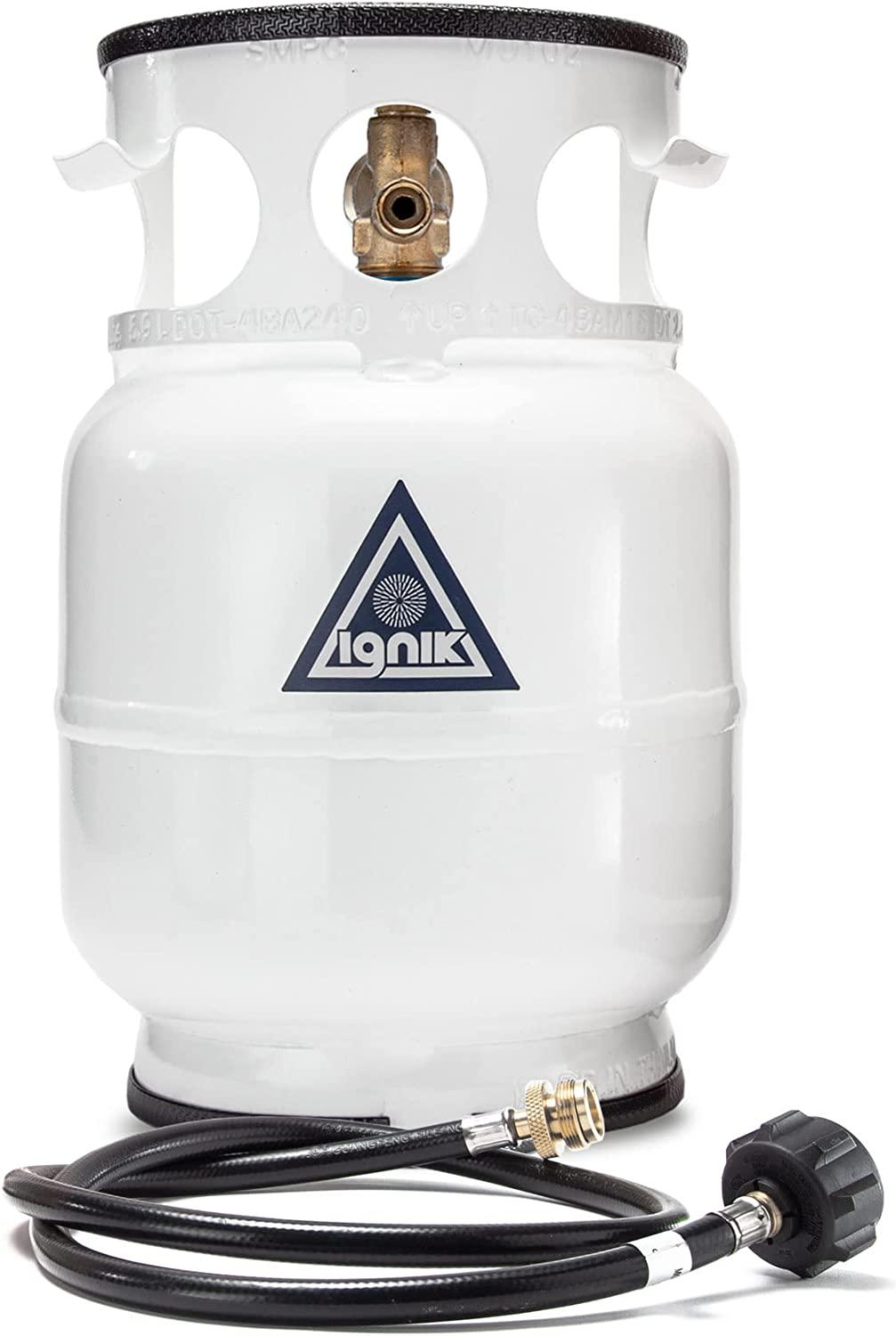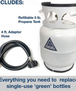 - 5-pound (1.2 gallon) refillable propane tank is more economical and less wasteful than single-use, 16-ounce “green” propane bottles and more portable than traditional 20-lb tanks