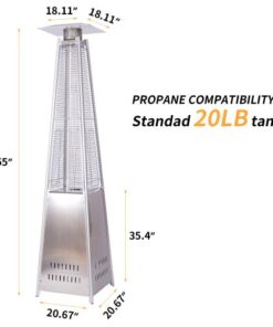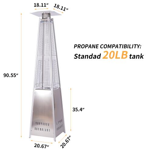 Description This Patio Pyramid Propane Space Heater has 46,000 BTU heat output in a circle. It only takes a few minutes to warm up quickly, which is a great heating solution for your outdoor socializing. With this heater, you can still enjoy the warm courtyard life when winter comes. Highlights 1.Quality Material Design:The heater is made of high quality stainless steel and glass tube, it’s designed to Provide and maintain optimal durability and perfectly complement your patio furniture and outdoor decor. 2.Built-in Propane Tank Design:Unique door opening design for built-in tank chamber makes it easier to place a 20-pound propane tank (not included). 3.Built-in Glass Tube Design:Quartz tubes display charming flames, adding decor to your yard. 4.Easy To Move Design:The heater is equipped with wheels at the bottom making it easy to move around when needed. 5.Easy Assembly&Operation: Heater features a simple push-button ignition for fast and simple operation, and a temperature control knob provides easy adjust ability of both the height and intensity of the dancing flame. 6.Auto Shut Off System:When heaters tip over or overheat,it will shuts off automatically to create protection. 7.Large thermal radiation range:Heat range up to 20 feet in diameter.Emits 46,000 BTU of steady warmth. Weight & Dimensions Overall Size: 20.67”x 20.67”x 90.55”(52.5 W x 52.5 D x 230 H cm) Reflective Cover Size: 18.11″x18.11″ (46×46 cm) Flame Cover Diameter: 8.27″ (21 cm) Item Weight: 59.5 lbs (27 kg) Carton Size: 53.15″x29.53″x7.1″ (135X75X18 cm) Carton Weight: 66 lbs (30 kg) Product Features Heater Shape: Pyramid-Type Heating Type: Gas-Heated Type Burner Material: Stainless Steel Color: Silvery Fuel: Propane Or Butane Gas Only Gas Tank: Not Included Applicable Type Of Gas Barrel: Standard 20 Pounds Of Propane Gas(Not Included) Adjustable Temperature: Yes With Movable wheels: Yes Power:13,000W Heat Output: 46,000 British Thermal Units Certification: ETL certificated、CE certificated About Assembly Package included :1xPyramid Heater Installation Required :Yes Level of Assembly :Full Assembly Needed Adult Assembly Required :Yes Installation time:30 minutes About Warranty Product Warranty : Yes Full or Limited Warranty:Limited Warranty Length : 6 Months Warm Prompt: All outdoor patio propane heater hose and regulator needs to do the soap water test to verify fitting for every the joints of the regulator and confirmed no bubbles or a hissing sound. If you see bubbles or hear hissing, pls double check the connections to avoid any risk. 1.Quality Material Design:The heater is made of high quality stainless steel and glass tube, it’s designed to Provide and maintain optimal durability and perfectly complement your patio furniture and outdoor decor. 2.Built-in Propane Tank Design:Unique door opening design for built-in tank chamber makes it easier to place a 20-pound propane tank (not included). 3.Built-in Glass Tube Design:Quartz tubes display charming flames, adding decor to your yard. 4.Easy To Move Design:The heater is equipped with wheels at the bottom making it easy to move around when needed. 5.Easy Assembly&Operation: Heater features a simple push-button ignition for fast and simple operation, and a temperature control knob provides easy adjust ability of both the height and intensity of the dancing flame.