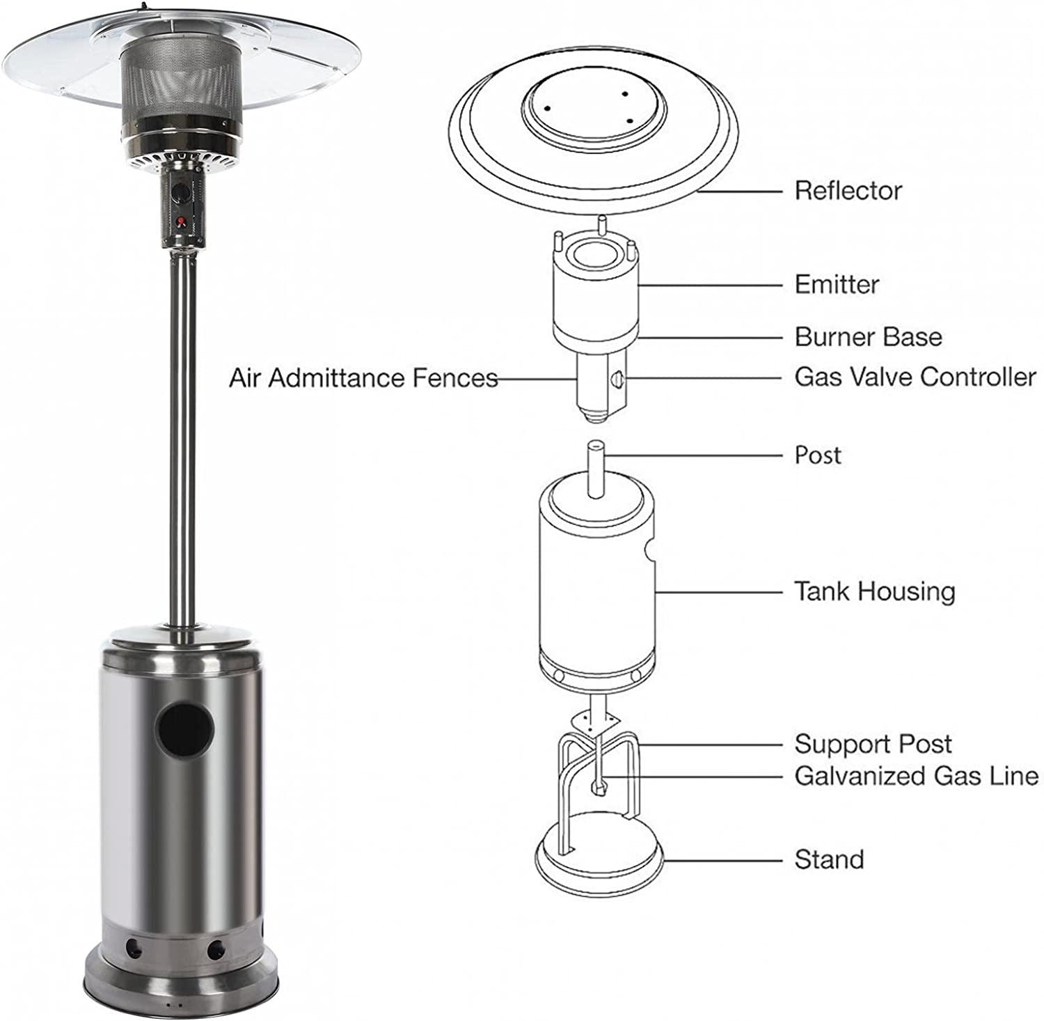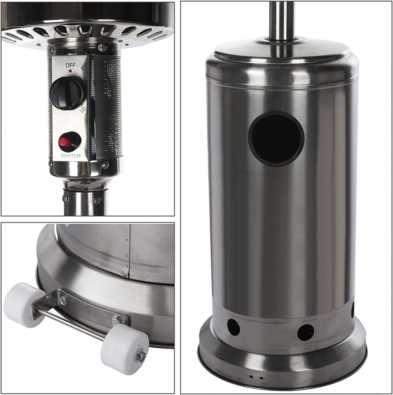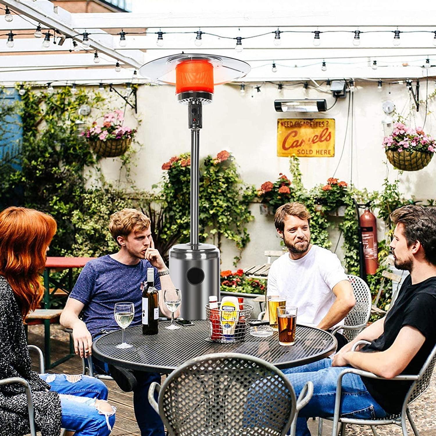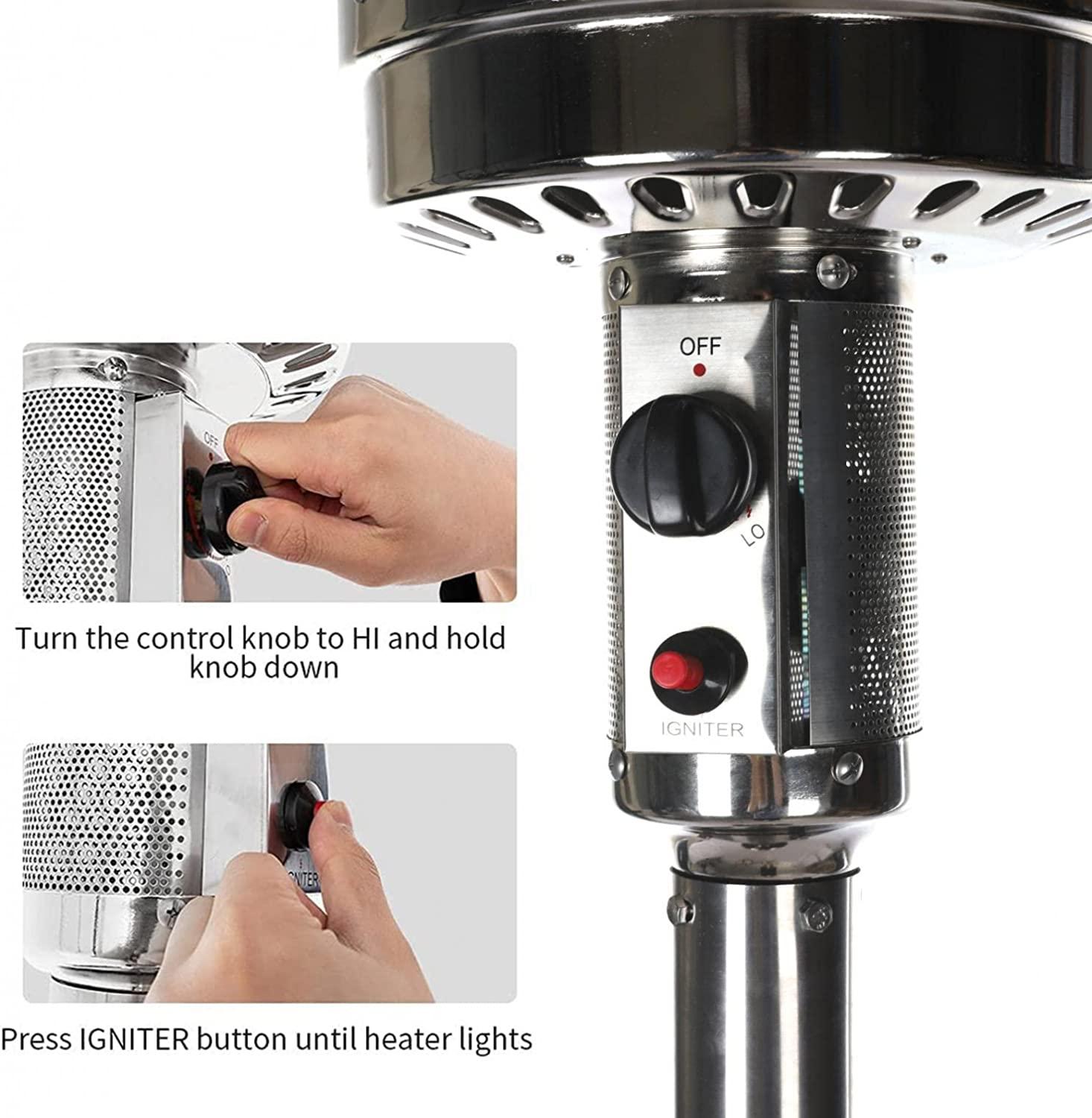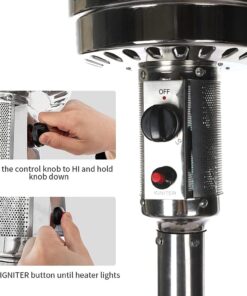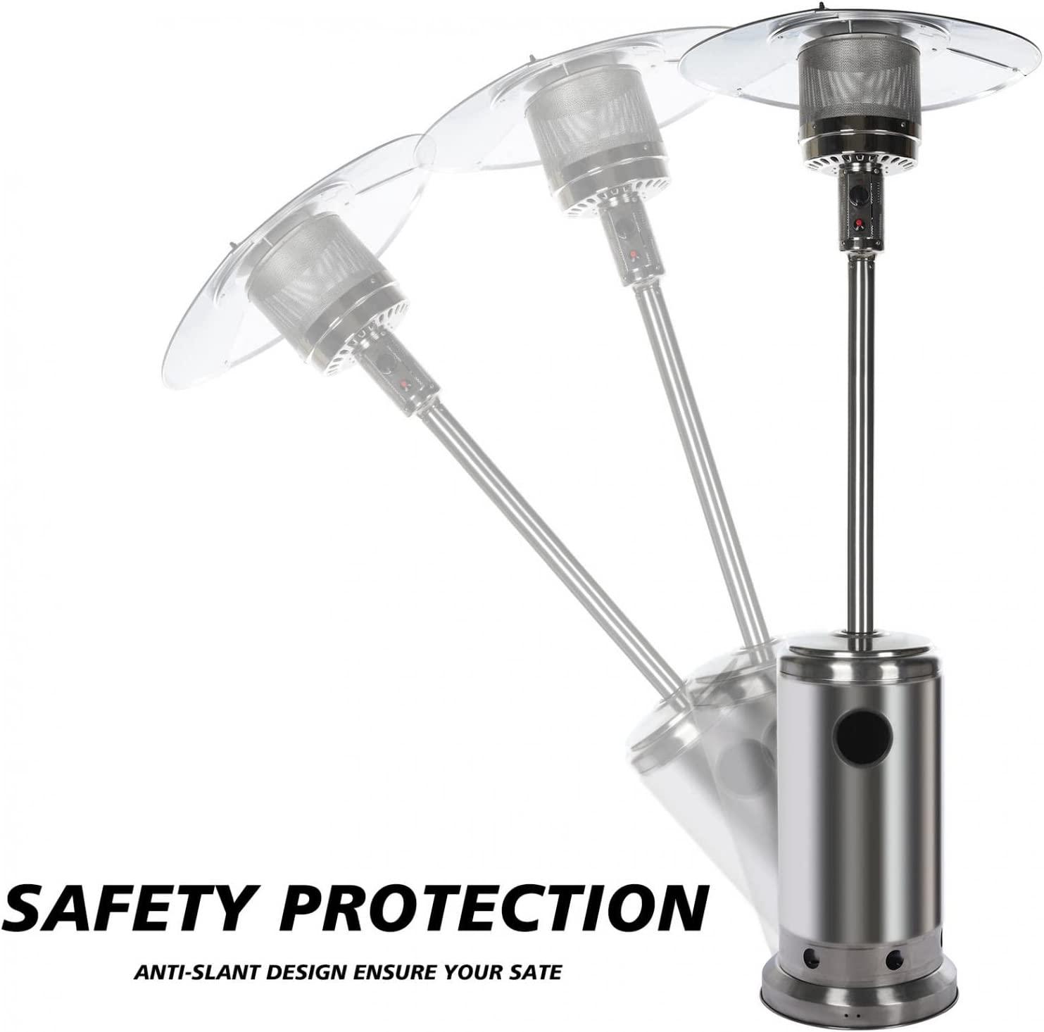 - Heating Up Quickly & Excellent Warm Range—This patio heater overall has a piezo electric ignition to ensure quick, seamless starts, and the adjustable heat control settings let you customize the temperature as needed. (Up to 46,000 BTUs of warmth.) It can heat outdoor spaces up to32.8-foot diameter heat range which is great to expand your outdoor gathering area during chill day, also beautiful matching piece to your porch, patio, back deck, backyard and pool.